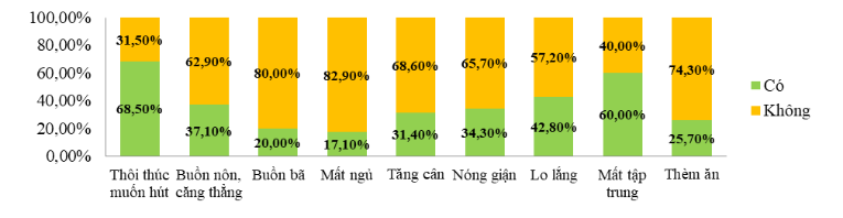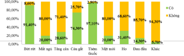 Kết quả mô tả triệu chứng từng xuất hiện sau cai thuốc cho thấy, 68,50% người cai thuốc có cảm giác thôi thúc muốn hút lại, 60,00% trong số đó có cảm giác mất tập trung trong công việc và sinh hoạt hàng ngày, 42,80% có biểu hiện tình trạng lo lắng,…Đây là những triệu chứng hoàn toàn phù hợp với y văn được ghi nhận trong hội chứng thiếu hụt Nicotin.