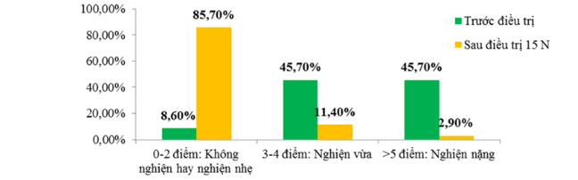 Như vậy, sau 6 ngày điều trị, thang điểm Fagerstorm có kết quả cải thiện rõ rệt, minh chứng cụ thể hơn là sự thay đổi phân nhóm nghiện thuốc trước và sau điều trị. Theo biểu đồ 4, sau 5 lần nhĩ châm loa tai (15 ngày) ghi nhận được nhóm không nghiện hay nghiện nhẹ chiếm tỉ lệ cao nhất là 85,7%, nhóm nghiện vừa chiếm khoảng 11,4% và nhóm nghiện nặng chỉ 2,9%. Kết quả này có ý nghĩa thống kê p < 0,05 (McNemar-Bower Test).