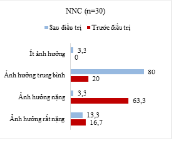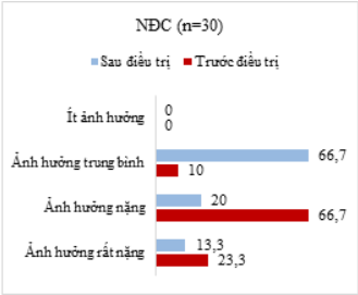 Sau 30 ngày điều trị, COPD chỉ còn ảnh hưởng mức độ TB đến nhóm nghiên cứu (NNC) với tỷ lệ 80%; tuy nhiên, ở nhóm đối chứng (NĐC), tỷ lệ này lại có sự phân bố rải rác ở các nhóm ảnh hưởng từ rất nặng đến TB, sự khác biệt giữa hai nhóm có ý nghĩa thống kê (p < 0,05).