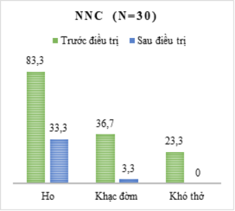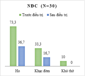 Trong nghiên cứu của chúng tôi, cho thấy 100% bệnh nhân không còn khó thở tại thời điểm sau 30 ngày điều trị, triệu chứng ho khạc đờm cũng có sự cải thiện đáng kể. Kết quả sự khác biệt có ý nghĩa giữa nhóm nghiên cứu (NNC) và nhóm đối chứng (NĐC), trong đó NNC tốt hơn NĐC (p<0,05).