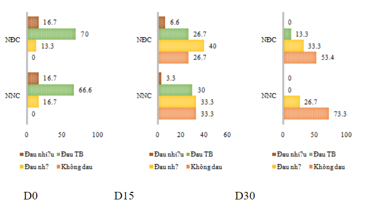 Nhận xét: Phân loại điểm đau VAS có sự khác biệt có ý nghĩa thống kê giữa NNC và NĐC (p < 0,05). Sau 30 ngày can thiệp, tỷ lệ bệnh nhân không đau ở NNC cao hơn NĐC.