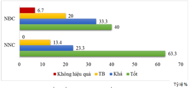 Nhận xét: Sau 30 ngày can thiệp, tỷ lệ hiệu quả ở NNC tốt hơn NĐC với 63,3% bệnh nhân đạt kết quả Tốt và không còn bệnh nhân nào ở mức không hiệu quả. Tỷ lệ này ở NĐC là 40% đạt Tốt và còn 6,7% không có hiệu quả/ không cải thiện sau can thiệp. Khác biệt hai nhóm p < 0.05.