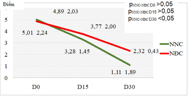 Nhận xét: Điểm đau VAS có sự cải thiện rõ qua các thời điểm nghiên cứu. Trong đó, NNC tốt hơn NĐC (p < 0,05).