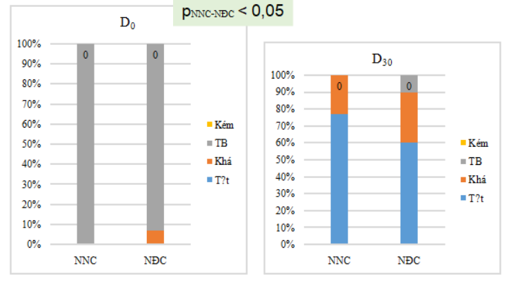 | Cúi (n,%) | D0 | 3(10,0) | 9(30,0) | 16() | 2(6,7) | 4(13,3) | 11(36,7) | 14(46,7) | 1(3,3) | D0 > 0,05 D15 > 0,05 D30 <0,05 |