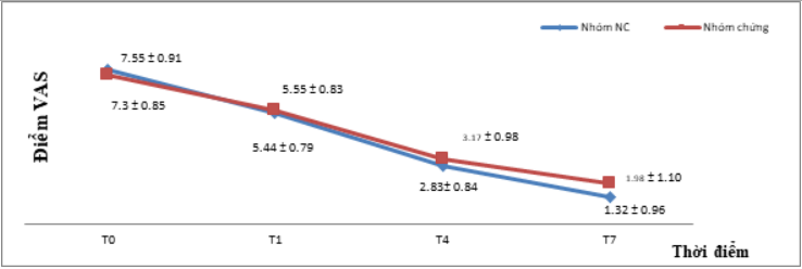 - Chỉ số VAS: Nhóm NC điểm VAS trung bình sau 7 ngày sau điều trị điểm đau giảm so với trước ngày điều trị và so với nhóm chứng có ý nghĩa thống kê (1.32 ± 0.96 so với 7.55 ± 0.91 và so với 1.98.