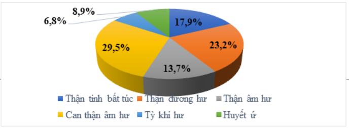 Nhận xét: Thể Can Thận âm hư và Thận dương hư gặp nhiều nhất với tỉ lệ lần lượt là 29,5% và 23,2%. Thể Huyết ứ và Tỳ khí hư ít gặp nhất với tỉ lệ 8,9% và 6,8%.