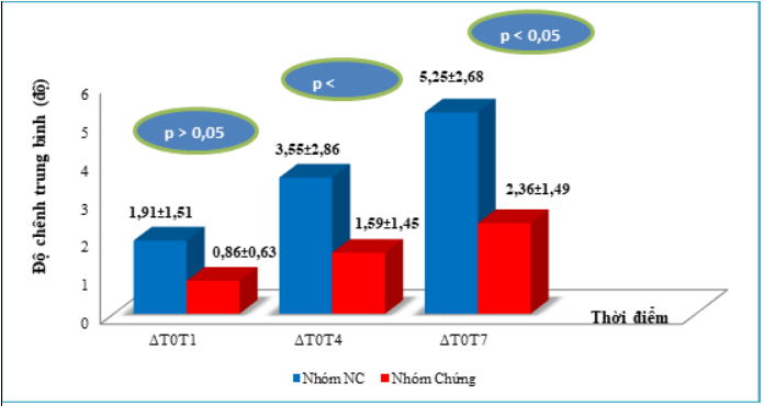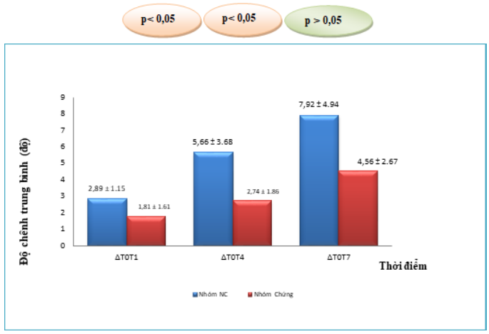 Nhận xét: Sau 1 ngày điều trị có sự cải thiện tầm vận động gấp và độ chênh trung bình TVĐ gấp của 2 nhóm nhưng chưa có ý nghĩa thống kê (p>0,05). Ở thời điểm sau 4 ngày và 7 ngày điều trị có sự cải thiện rõ rệt về độ chênh trung bình TVĐ gấp của 2 nhóm với p<0,05. Độ chênh trung bình ở thời điểm T4 và T7 của nhóm NC cao hơn so với ở nhóm Chứng với p<0,05.