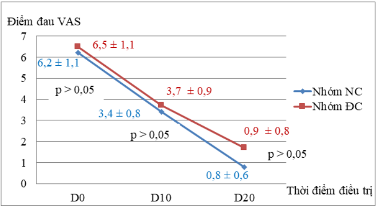 - Sau 20 ngày điều trị, điểm VAS trung bình ở cả 2 nhóm giảm rõ rệt so với trước điều trị (p < 0,05). Tuy nhiên sự khác biệt mức độ giảm điểm VAS ở 2 nhóm không có ý nghĩa thống kê (p > 0,05).